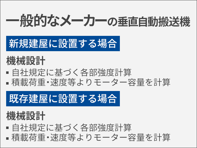 ※現在お使いの簡易リフト(荷物用エレベーター・荷物用リフト等)の仕様によって、垂直自動搬送機に変更できない場合もございますのでご了承ください。